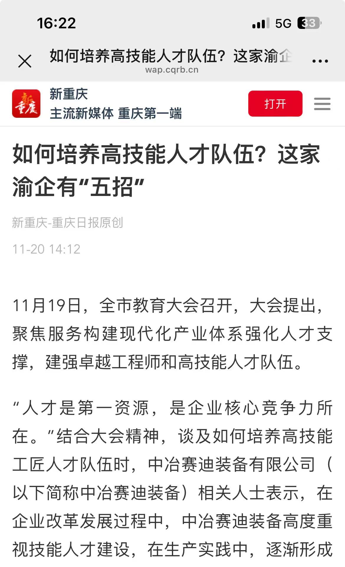 11月19日,全市教育大會召開,大會提出,聚焦服務構建現代化產業體系強化人才支撐,建強卓越工程師和高技能人才隊伍。 11月20日,新重慶-重慶日報以“如何培養高技能人才隊伍?這家渝企有‘五招’”為題,報道中冶賽迪裝備在技能人才建設中的經驗做法。