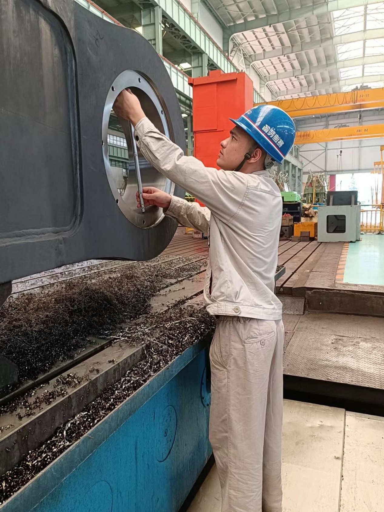 在公司首次承制的“傾動減速機”項目中,其箱體中心孔為直徑φ1750毫米,業(yè)內(nèi)還從未在鏜床上加工過如此大規(guī)格的孔。我們憑借多年經(jīng)驗,并多方考慮公司設(shè)備的特性,提出了“平旋盤+卡座+標(biāo)準(zhǔn)鏜盤”的加工方法,自主設(shè)計制作工裝,終于趕跑了這個“攔路虎”,完成了公司首次φ1500mm以上鏜孔的加工。這些核心裝備在客戶那里實現(xiàn)了穩(wěn)定運行,幫助客戶生產(chǎn)出優(yōu)質(zhì)產(chǎn)品。這讓我感到由衷的自豪。